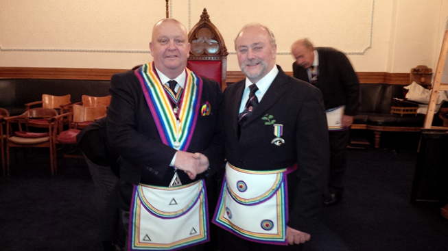 W.Bro. David Bell Prov.RAMGR with the candidate Bro. Frank Kennedy. |