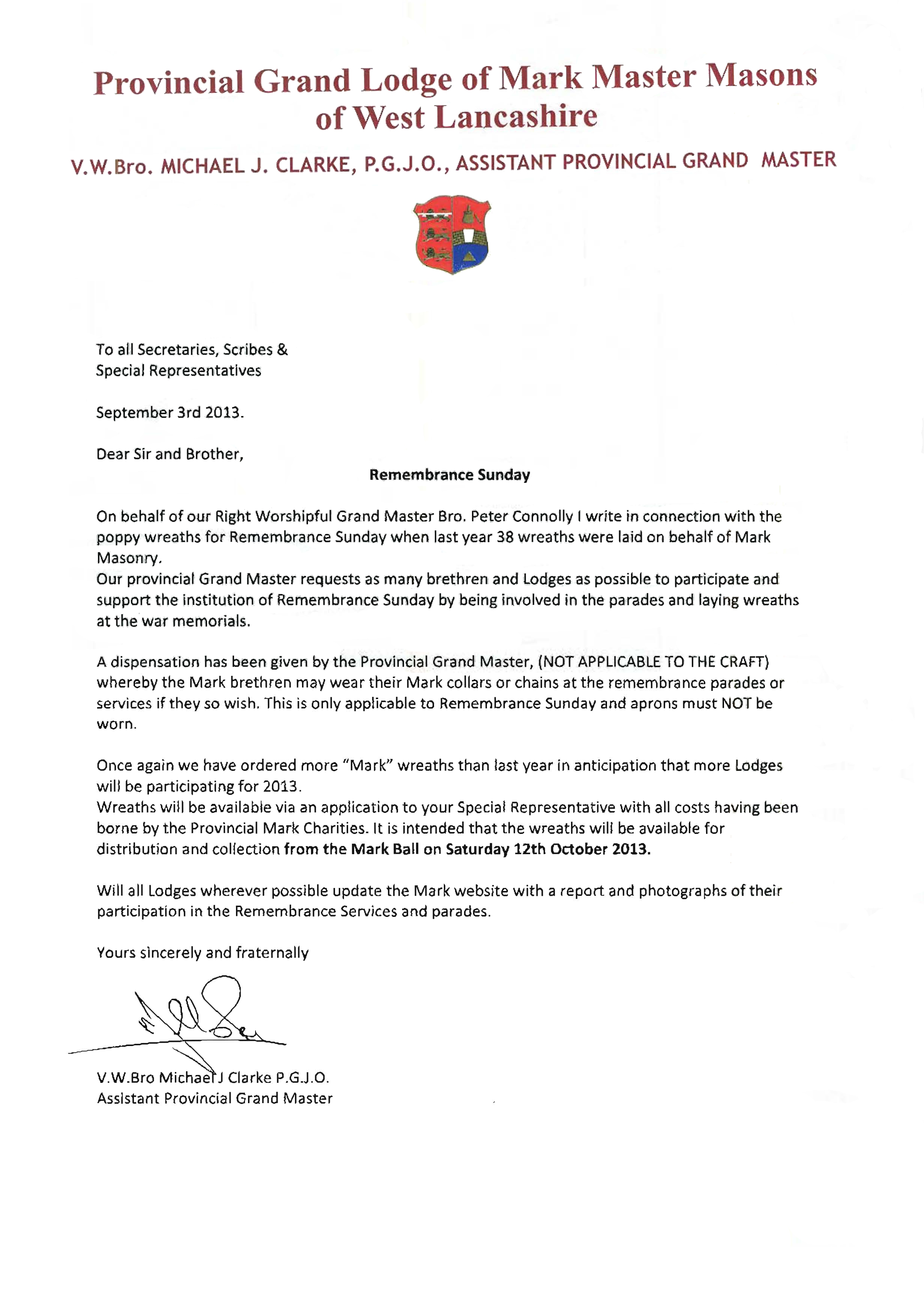 With 38 Mark wreathes laid last year and even more alreay ordered please think were else you can support, and gently promote our image as freemasons. Please see Michael Clarke's letter below and join in Peter Connolly. |