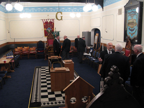 Having paid my dues I walked round the corner, case in hand in to a lovely square, (which I found to be round) next to the side of a church, what a really charming place. Then bingo there it was near to the old Police station, a period building full of character adorned with a square and compass above the entrance. Once inside we were welcomed by members of the Lodge and shown upstairs to the Lodge room area, as usual lots of friendly chat and guess what I overheard two or three Brethren saying that their versions of Tom were also telling them to turn left, turn left, ah well !! | |