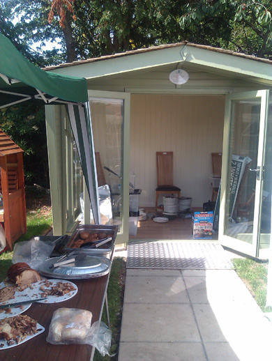 In glorious sunshine our PGM was invited to the ' Friends of Tithebarn ' Hog Roast on Sunday afternoon. Matron, or the Manager of the home as she is now known, staff and most of the residents were there. All the friends, and over 60 supporters gathered in the large marquee to enjoy a sumptuous carvery. | |