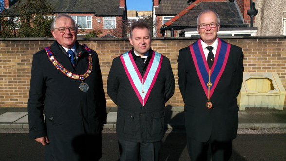 Bro. Patrick Kent, (IG of Allen Poolley Mark) laid our wreath for the first time. Our usual wreath layer -- W.Bro. Chris Walls (Pr G Stwd, Corinthian Mark) was in support as was E.Comp. John Walker, (SE of Chapter of Liverpool). John lives on the road where we march past, saw us last year, and asked if he could join us this year. An erstwhile recruit for Mark, we hope. | |