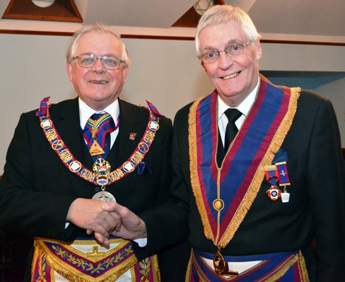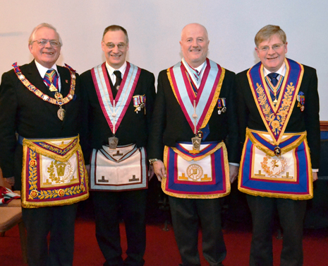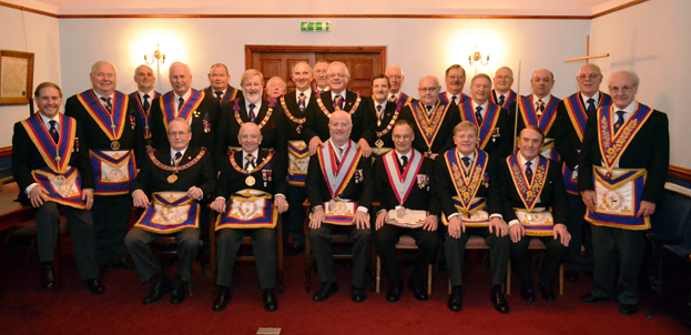 Peter was accompanied by Deputy Provincial Grand Master Keith Beardmore and Assistant Provincial Grand Master Ian Nairn to witness the Worshipful Master, Russell Green install his successor Derek Easton in a very able, pleasant and enjoyable way. For the ceremony the two Provincial Wardens took their places in the wardens chairs and Ken Hickson acted as Inner Guard.