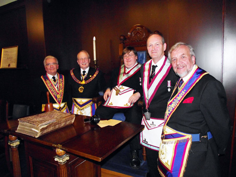 Steve asked Andrew Stansfield of Imperial Mark Lodge No 1276 to assist him in the ceremony by occupying the chair of SW, Tony Thackeray of Prince Setanta Mark Lodge No 1446 that of JW, and Jim Barnes of Cleveleys Mark Lodge No 1176 to act as IG. | |