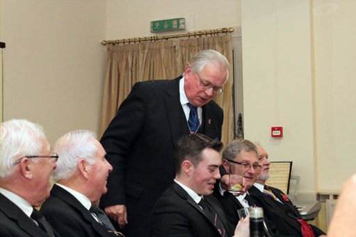Chris was accompanied by W Bro Professor Gareth Royston Jones, PhD, BSc, PAGDC since 2009, the WM of University Mark Lodge. W Bro John Price, MA, CEng, Fellow of the Institute of Mechanical Engineering, is a PPrGJW in Mark, and PJGD in the Craft since 2003, and is the senior past Master in University Lodge. As John proposed Chris into University Mark Lodge, he was doing his duty here, in making sure Chris was well looked after, less than 2 months after he was advanced. | |