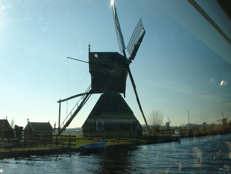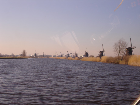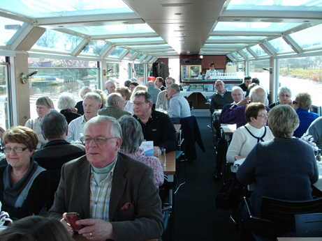 The group then boarded an electric powered glass barge which could raise or lower itself in the water to get under the bridges. It did this by pumping water into the bilges and by pumping it out when it needed to raise its level. The cruise down the canals lasted for 2 hours and enabled the party to see various aspects of Dutch country life with many random windmills. | |