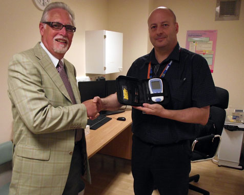 Peter Clay presents Sean O’ Brian with Wyre Lodge’s gift of a Coaguchek system.