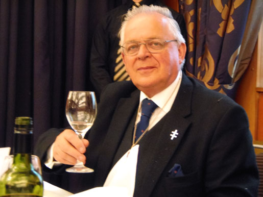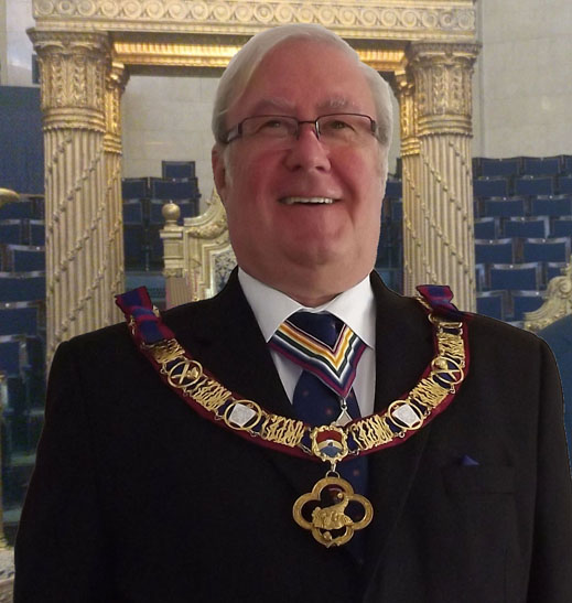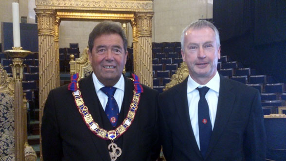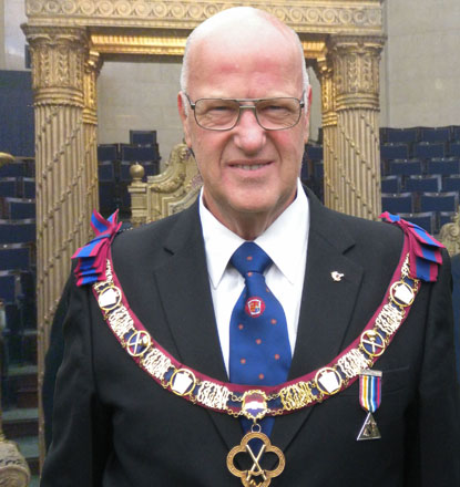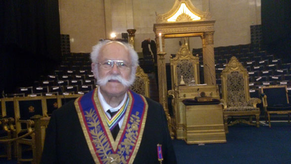 Geoff Catterall, opposite, "a working Steward on the day, controlling the Temple front side door. Because of his position suddenly found himself responsible for handing over the Pro, Dep and Ass GM's chains of office, in the middle of the ceremony." |
