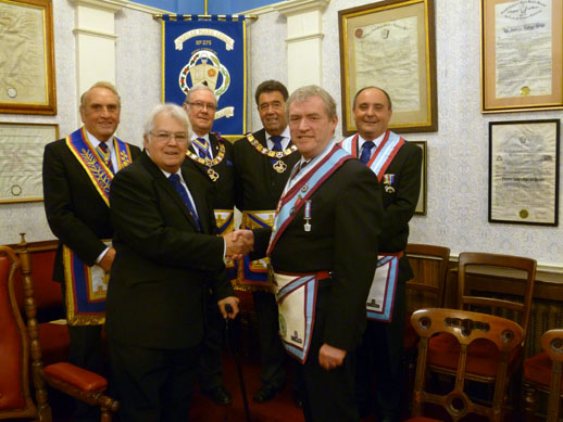 As he is not very good on his feet at present outgoing W.M. John Shepherd handed over the reins to his predecessor Ray Dickinson who performed the installation ceremony with some distinction.