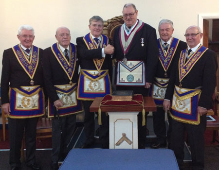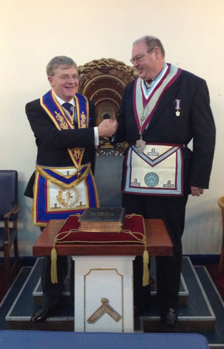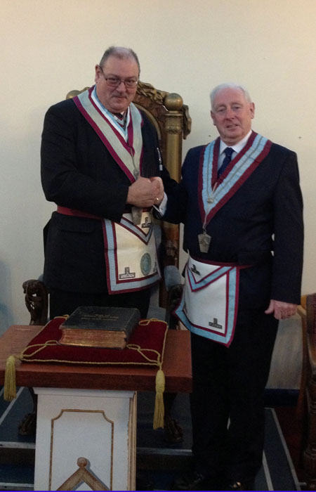 Members and visitors were privileged to witness an excellent Installation ceremony when Bro.Mark Holloway was installed into the chair of Adoniram by the Installing Master W.Bro. Mike Melling. W.Bro Melling was well supported by Past Masters of the lodge with the addresses to the new officers. | |