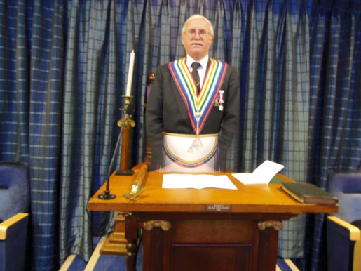 Both he and the brethren of the lodge watched a faultless ceremony performed by the outgoing Worshipful Commander Ken Roulston. Which also included the address to the new Worshipful Commander Bro. Edwin Fisher. | |