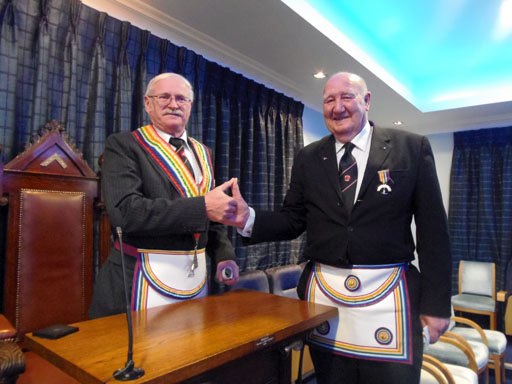 W. C. Bro Ken Roulston congratulating newly elevated Bro. Bob Whittingham |