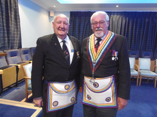 W. Bro. Andy Baker who did the working tools and W. Bro. Peter Watson Pr.RAMGR. Who explained the steps. An excellent festive board was then enjoyed by all | |
