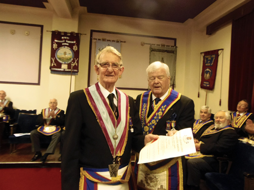 W. Bro. Neil Emmett Being Presented with his Patent by W. Bro. Bob McGown |