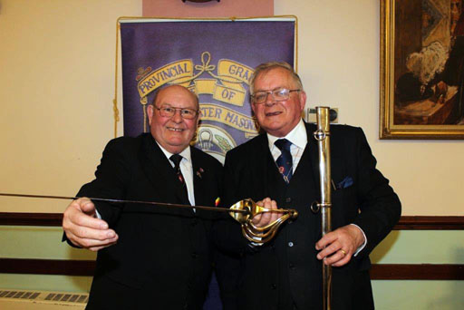It was used for the first time this season at Temperance Lodge in Hope Street, where the PGM Peter Connolly acted as Senior Deacon of the Lodge for an advancement ceremony, conducted by his Wardens, Giles Berkley & Peter Hegarty. Because the Provincial Deputy Grand Sword Bearer, Steve Clarke was present, he processed in with the PGM and his Wardens, and happened to notice that the sword was in a really poor state of repair. He asked David Emmerson the Provincial DC if he could perhaps take it for refurbishment in the future, and David agreed wholeheartedly. | |