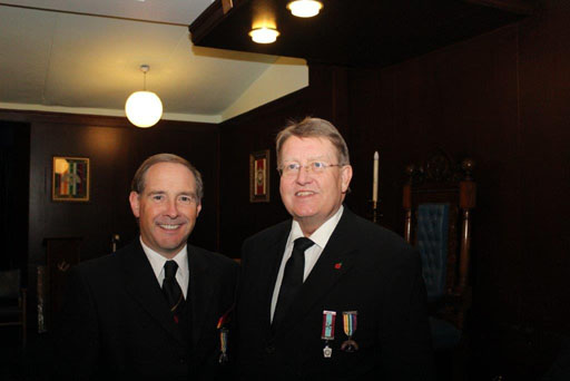 Alan Fairhurst told us of the committed nature of Joe O'Brien, and the work he has carried out through his Masonic career, especially at Royal Oak Lodge. He also reminded us that Joe served in our Armed Forces, and visited both the Falklands and Beirut - tough assignments indeed! Alan wished Joe and his superb new team a wonderful year, and Joe responded by expressing the wish that we all keep up the standards of the Lodge during the coming year. | |