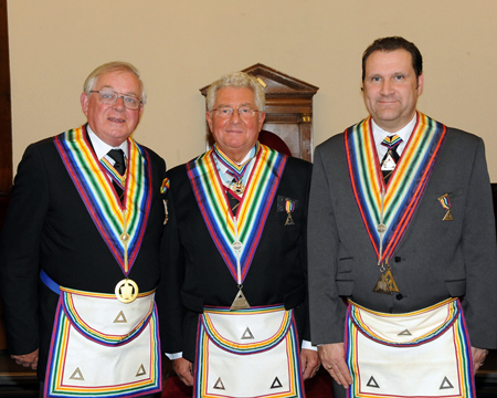 Following a report the Provincial Grand Director of Ceremonies entered the Lodge and announced that the Provincial Grand Master was demanding admission. Darren readily acquiesced to the demand and Peter, accompanied by those of the team who are Royal Ark Mariners, entered the Lodge and joined the other Grand Lodge officers Jack G Forsyth, Frank A Starkey & Eric Drinkwater. | |