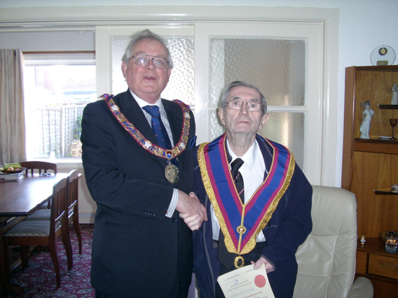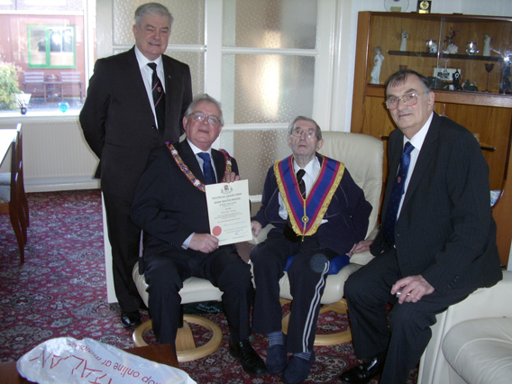 W.Bro. Stan Howarth was delighted to receive a letter from Province offering him the rank of Past Prov. Grand Junior Deacon which would be conferred on him at the Provincial meeting in May 2014. Sadly Stan's deteriorating health ruled out him attending. After discussion with Brian Molyneux the PGM's Special Rep. for the area, an approach was made to our Prov. Grand Master who immediately agreed that the matter deserved special consideration. | |