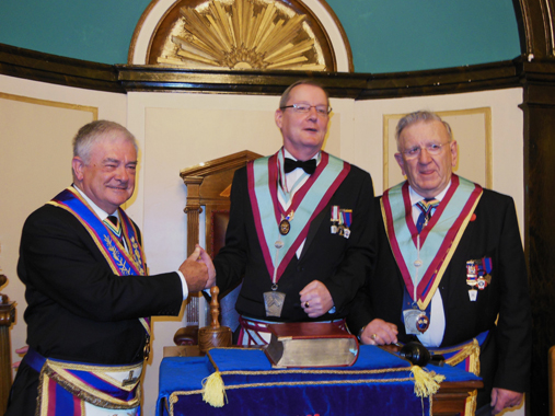 VWBro. Brian Molyneux PGJO, Bro Eric Poole and W.Bro. Richard F. Wilson PGSt’dB. Installing Master