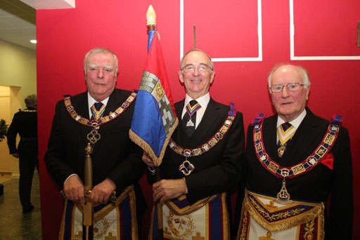 This was a huge occasion for all those who took part, and they must really have felt quite nervous, but despite all that pressure, I thought the Pro Grand Master did quite well! He then excelled himself by unexpectedly calling for W Bro Colin Mills to be brought before him...... The assembled brethren were stunned when Colin, who works really hard in our Provincial office, was promoted to Grand Rank - that of Past Grand Standard Bearer. Understandably, Colin was quite unable to speak as he accepted the prolonged and rapturous applause from the Lodge. This was indeed a very rare honour, to get a promotion in the Province from the Pro Grand Master, and one that Colin will never forget. | |