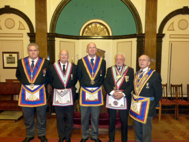 After the ceremony the brethren retired to enjoy a first class festive board. During the festive board The Right Worshipful Provincial Grand Master (craft) Brother James Anthony Harrison (who was attending another meeting in the building), called in to give his congratulations to the Worshipful Master and to take wine with the assembled brethren. He was accompanied by the Assistant Provincial Grand Master Mark Dimelow P.S.G.D and the Provincial Grand Director of Ceremonies Keith Kemp. |