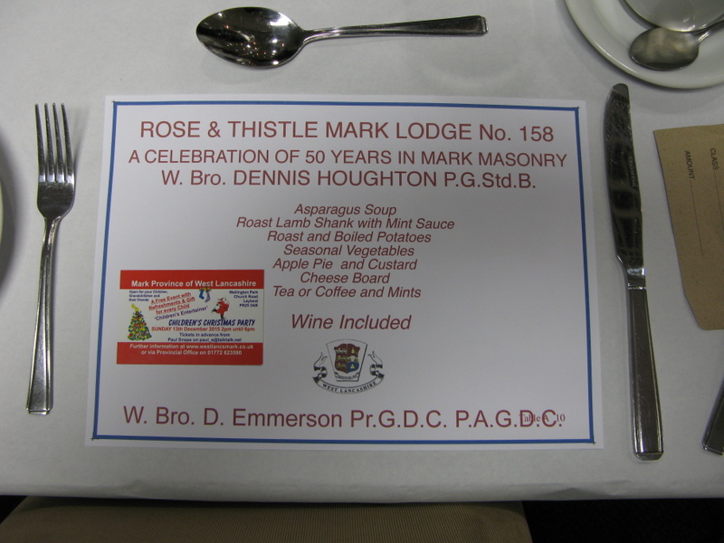 Dennis has already celebrated 50 years in the Craft, but this was a very special occasion as very few Freemasons manage to achieve 50 years, in the Mark Degree in which he holds Grand Mark Rank as Past Assistant Grand Standard Bearer. He has been a member of one of the oldest and most respected lodges in the Province, Rose & Thistle Lodge No 158 since October 1965. Rose & Thistle Mark Lodge arose from the fusion of English and Scottish Mark Masonry in the 1860’s, hence the name – The Rose of Lancashire and the Thistle of Scotland and very aptly named it is. |