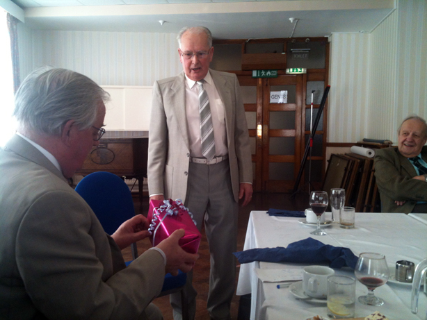 John then presented V. W. Bro Keith Beardmore with a table lectern fashioned in mahogany to mark his forthcoming appointment. The photos show the Grand Officers in relaxed mode | |
