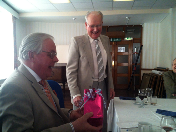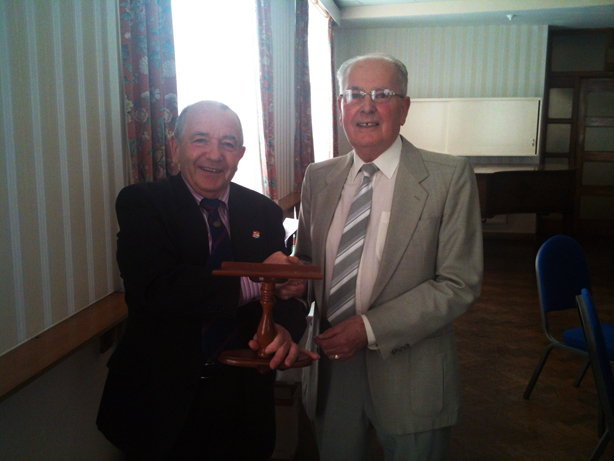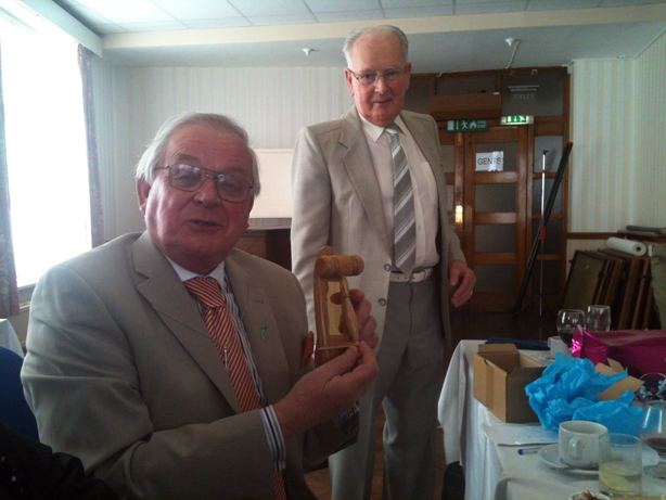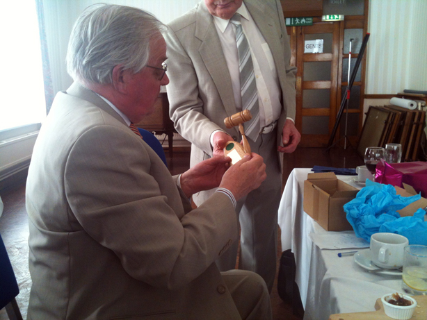 At the conclusion Artificer W. Bro John Powell presented the PGM with a commemorative Gavel and Stand fashioned in oak to mark his retirement from Office. | |