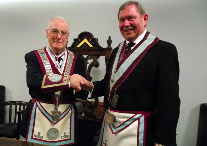 Bill Snell (left) is congratulated by Stephen Walls on attaining the Chair. |