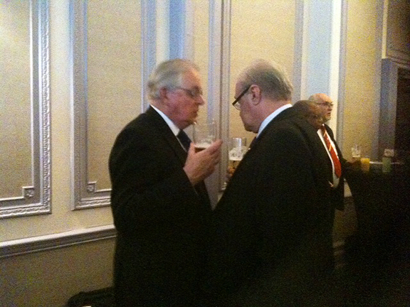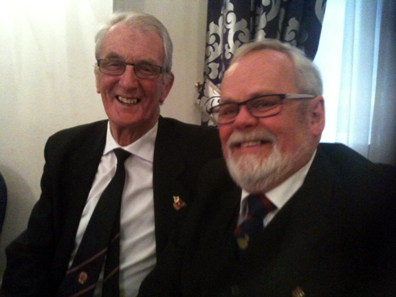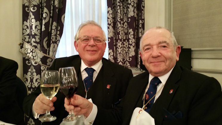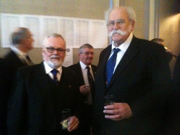 Photos show the Brethren in fine spirits. It is not true that Dep.PGM Keith Beardmore was interviewing for 2 new minders but is shown with W Bro Chris Walls who met up with his brother, who lives in London, after the event. | |