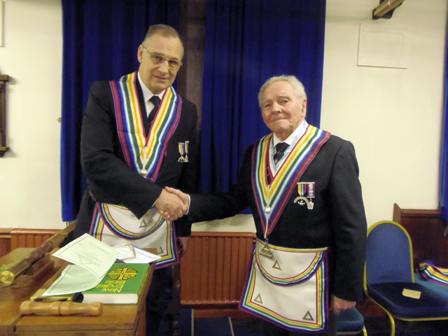 W.Bro. D. Moss Congratulates Incoming Commander W.Bro. Russell Green