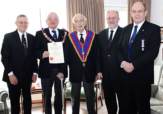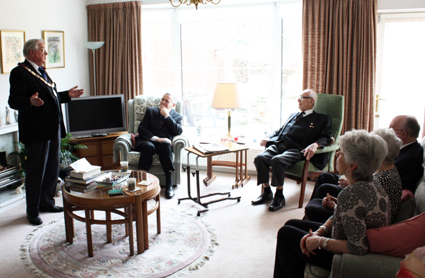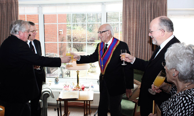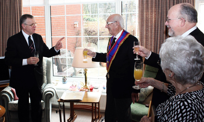 W.Bro. Paul Lamb of Southport Mark Lodge No. 473 had a very special visitor to his home recently. It was none other than Provincial Grand Master, Brother Peter Connolly accompanied by W.Bro. Brian Molyneux PGJO and fellow Mark Lodge brethren, W.Bro. Colin Jenkins, Southport Group Chairman and W.Bro. Chris Hamilton PPrGReg. | |