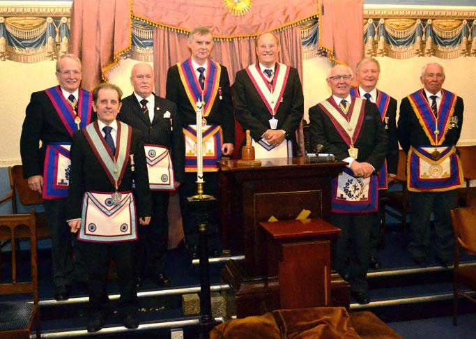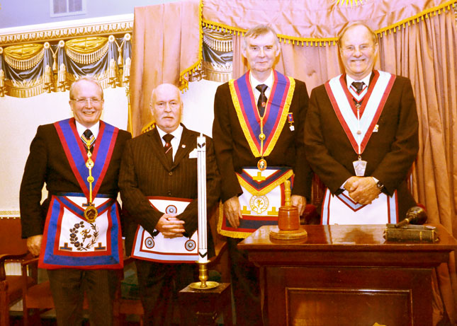 Worshipful Master Chris Marsden did the earlier part of the demonstration ably assisted by Assistant Provincial Grand Master, Ian Nairn, acting as Senior Deacon despite an injury to his abdomen caused by an accidental fall. Worshipful Brother Ian Walsh then took over for the remainder of the ceremony.