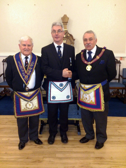 Bro Parry can be seen being welcomed by Mike Clarke APGM and W. Bro Norman Stringfellow. |