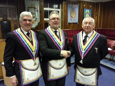 The lodge was opened and the team were invited into the Lodge, the P.G.M. was offered the sceptre of the Lodge to which he kept and spoke to the Lodge and introduced the members of the Provincial Team, the Commander, Gordon Pilkington, was given the sceptre back and continued to Install the Commander Elect, Edward Adams, into the Chair. | |