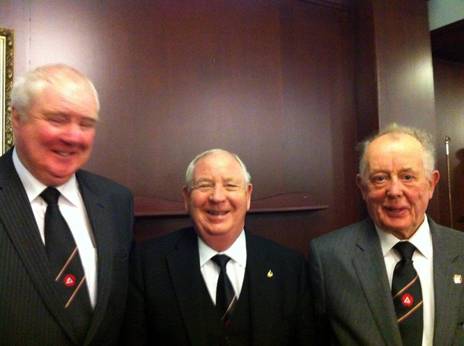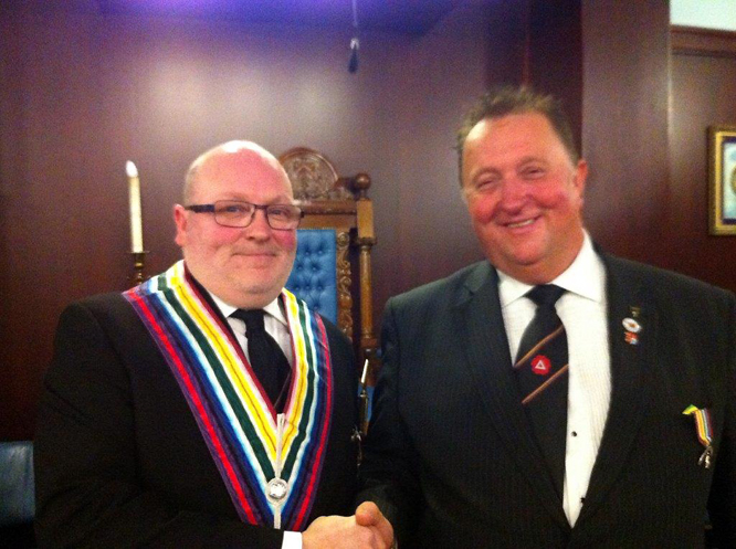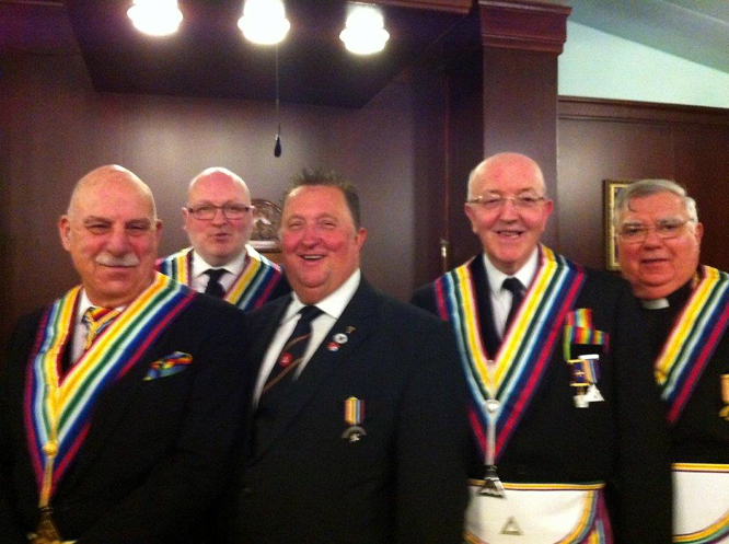 Brian was proposed by the Worshipful Commander Joe O'Brien, who did a stunning job on the ceremony, including explaining the signs, which is even more remarkable due to the fact that this was the first ceremony of his reign as WC. The very hard-working Scribe, Jimmy Rogers seconded Brian, and has his eye on 2 more candidates for the Lodge - well done Jimmy. | |