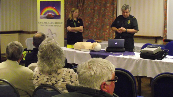 The roll out of defibrillators provided by Mark Masonry continues apace throughout the Province of West Lancashire and Masons meeting at Adelaide Street Masonic Hall, Blackpool, as well as quite a few of their ladies, took advantage of an information session where they were welcomed by Deputy Provincial Grand Master Keith Beardmore. | |
