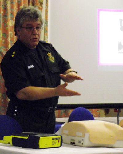 Ian took his audience step by step through the defibrillator procedures and also spoke of some real life cases he had and Carolyn had been involved in. He also gave some helpful hints on safety at the scene of an incident, maintaining the dignity of the patient, particularly where the heart attack victim is female, and the importance making sure that the 999 call has been made. | |