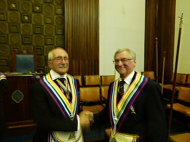 Worshipful Commander Mike Winterbottom congratulates Worshipful Commander elect Les Moore. |