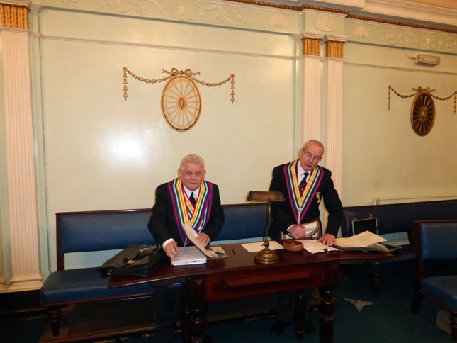 Treasurer and Scribe hard at work, W.Bro Davis Karsa and W.Bro Syd Ford. |