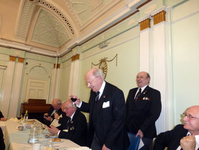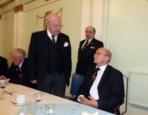 After the excitement of the elevation ceremony and the Worshipful Commander was safely back in the chair we were ready for the big event, the Installation of the W. Commander Elect. W. Bro Tom Marlow performed the ceremony of installation and placed W.Bro Mike Winterbottom into the Chair. At the completion of appointment and investing of the officers W. Bro David Emmerson RAMGR delivered the address to the W. Commander. |