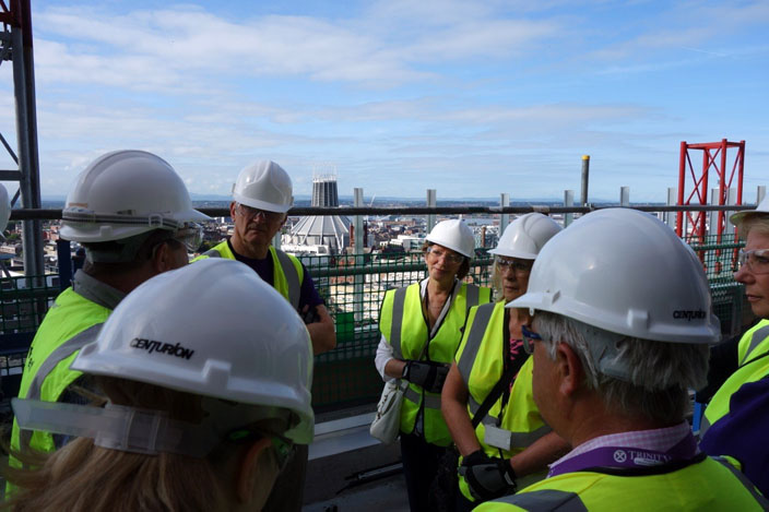 As the group toured the building they became very appreciative of the panoramic views afforded to them including the restaurant near to the top of the building. This will be for the use of patients, visitors, and guests and will easily rival anywhere in the city regarding the views of the buildings, across the Wirral and the Welsh hills clearly seen in the distance. Of course, depending where you are in the building, the view alters, and the new stand at Liverpool Football Club clearly enhances the panoramic pleasure for all. After a three-hour tour, covering the whole building, the group returned back to the current hospital where after divesting themselves of all the health and safety equipment, the ladies particularly pleased to swop the steel toe capped boots for their own footwear, they relaxed with coffee and cake in the sunshine. |