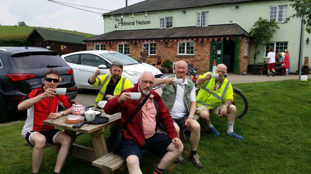 On completing their lunch outside The Two Boats Inn, a traditional canal side inn located on the Grand Union Canal, in the village of Long Itchington, South Warwickshire. During this time the support team had rescued Geoff and his bike, then making their way to the next major scheduled stop at The Admiral Nelson, yes, you have guessed correctly, another charming pub on the canal bank, this time situated close to Braunston, near Daventry. |