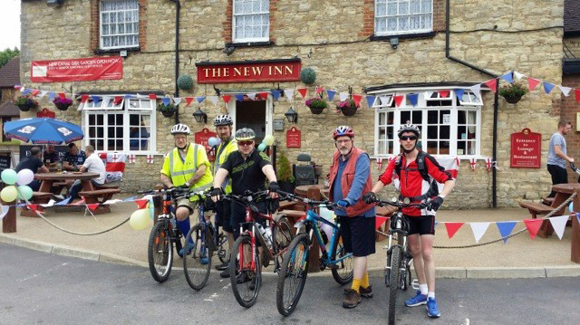 The best laid plans of mice and men etc. was certainly true at the next refreshment stop, or not, as things worked out. Just as the support crew came to turn into the road to take them to the canal near Wolverton, Milton Keynes, the cones went across and the road was shut. Quickly looking for another route they cut through the town center and there found another route towards the canal only to find that too had been closed. Parking in a nearby Tesco to re-stock with drink and sandwiches another route to the canal was quickly worked out, and just as quickly abandoned, as the car park was now closed off to let the annual MK Dons carnival get underway. Yes, you guessed correctly, the carnival was starting just yards from where the support vehicles were parked. Eventually escaping, the support raced to the New Inn, a traditional pub situated right on the canal side in New Bradwell near Fenny Stratford just in time to meet the riders arriving for lunch. |
