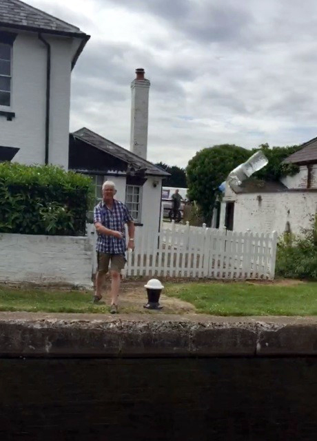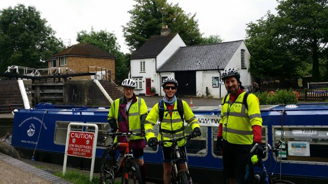 On completion of this the riders continued south back into open countryside with access problems for the support crew, and the only answer at one point was to throw the supplies across the canal. It was at this point that Steve Walls displayed his long passed cricketing skills in catching the water and flapjacks hurled across by John Bruffell. Two interesting events happened along this stretch, firstly the meeting with three ladies carrying their multiple kayak along the bank, and on enquiry it was found they were practising for their future charity event, to row the length of the Grand Union Canal which they plan for May 2017. |