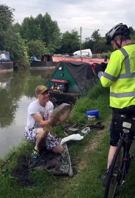 A number of miles further downstream the riders met Liverpool F.C. fan, the aptly named Phil Neal, who, to the delight of himself and fellow anglers had just landed a rather large mirror carp which weighed in at fifteen pounds plus. None of the team being avid anglers this was the first view of the species for all of them. Phil was rather aggrieved when it was suggested that all that was now lacking was a few bags of chips and a bit of sauce. |