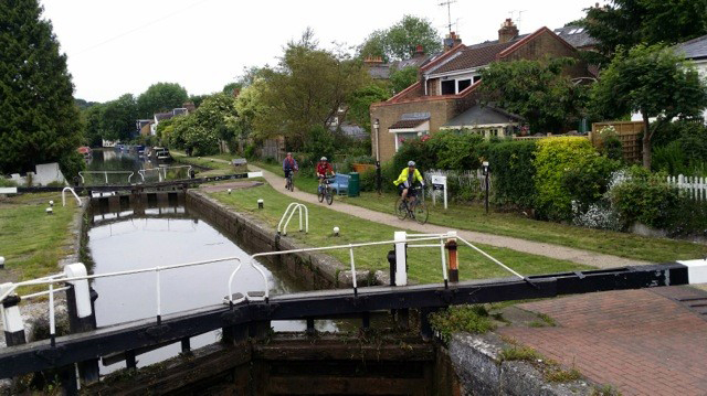 Leaving Rickmansworth the cyclists headed along through Cowley Peachey before taking the left turn at Bulls Bridge Junction, which is near to Slough, and along the Paddington Arm of the Grand Union. This stretch of canal is one of the longest in England without having a lock to contend with, 27 miles from Cowley to Little Venice at Camden. Skirting Southall and passing through Greenford the canal now enters the industrial sections of west London passing between Acton and Harlesden with the cyclists using the North Circular Aqueduct high in the air. |
