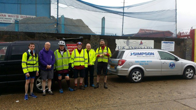 Surprisingly, this stretch of the canal is not as one would envisage, it is not a vista of unremitting doom and gloom and bygone industrial wasteland. Nature shows itself in all its glory as willows and wild flowers flourish alongside the canal banks, making this a rural artery and a wildlife sanctuary. It is only when the tranquility of the canal is left behind, as the riders discovered, that you enter the industrial acreage which still abounds. A pre-planned rendezvous with the support vehicles was made at the bridge near to Wormwood Scrubs prison, but with parking not allowed on the bridge and roads, a nearby kindly scrap-metal dealer gave the use of his yard to the team to have their break. Not an ideal spot but very much appreciated at the time. |
