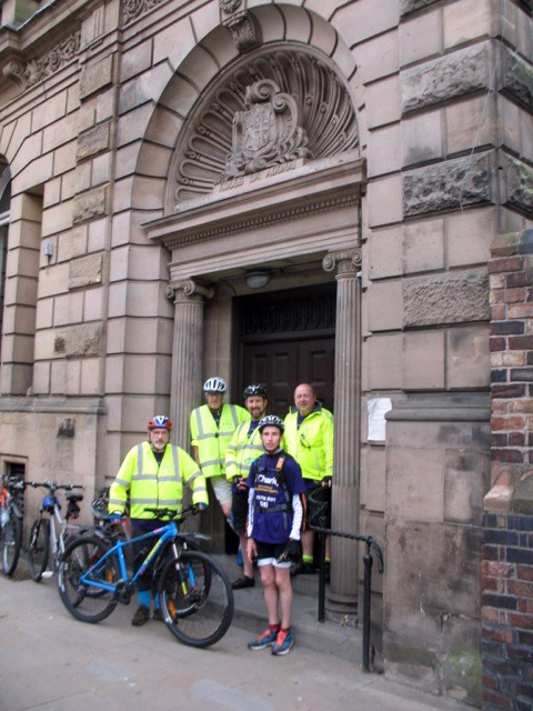 On the first day of the ride the group assembled inside the foyer of the Royal Liverpool Hospital for a publicity call arranged by “The R Charity’ which co-ordinates the hospitals fundraising. They had supplied t-shirts for everybody on the ride, alongside the hooded sweat tops and reflective jackets donated by Tony Cross of T & S Design Services of Preston. From the hospital it was only a short ride through the University grounds and into Hope Street for another photographic stop outside the Liverpool Masonic Hall. Now began the ride proper, Hope Street to Great Queen Street. |