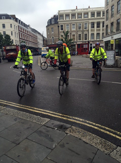 Back into the saddle and pedaling yet again the riders soon passed through Berkhamsted and in the sprint finish at the end Dave Fisher took the points, closely followed by Chris Bruffell and Geoff Cuthill. Sensibly, Steve and Jason kept at their steady pace keeping their reserve of energy for the last day. Todays mileage was measured at 58.17 bring the total so far to 237.17 since the leaving of Liverpool. Booking in for the evening at the Premier Inn at Hemel Hempstead the team ate a hearty evening meal and pre-booked the breakfast requirements for 7 o’clock the next morning. |