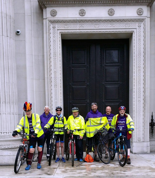 For the third year in a row the Crafty Companions Cycling Circle undertook their charity bike ride. The inaugural run just two years ago, had been a simple affair in cycling along the tow path for the length of the Leeds Liverpool canal, finishing under the world famous Royal Liver Building. Last year was a slightly longer trip following canal paths from Kingston upon Hull, through Castleford and Manchester, again finishing in Liverpool under the Liver bird. This year an alternative direction was conceived with the first thought being London to Liverpool. After initial planning it was suggested by one of the team, who after studying the map intensely, that the route be reversed, going from Liverpool to London, after all, that way it would all be downhill. The start would be at the Royal Liverpool Hospital, a quick call for a photograph at Liverpool Masonic Hall and then along the canal systems and on to the headquarters of United Grand Lodge at Great Queen Street, in London. And so the planning began. The Street to Street Charity Bike Ride was born. |